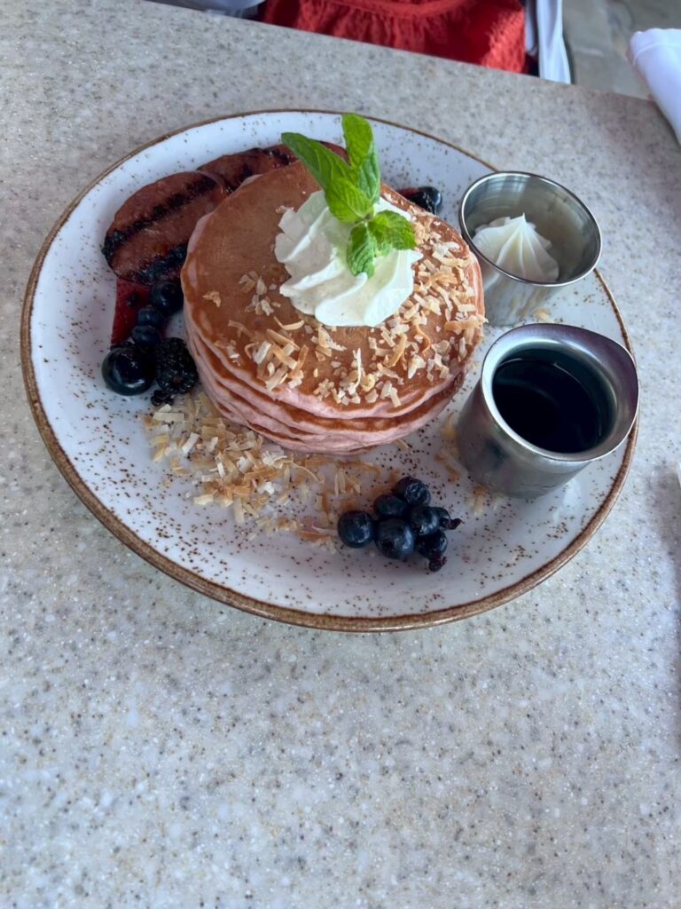 ビーチを目の前にしたテラス席で、ピンクのパンケーキをいただく時間は、まさに至福。