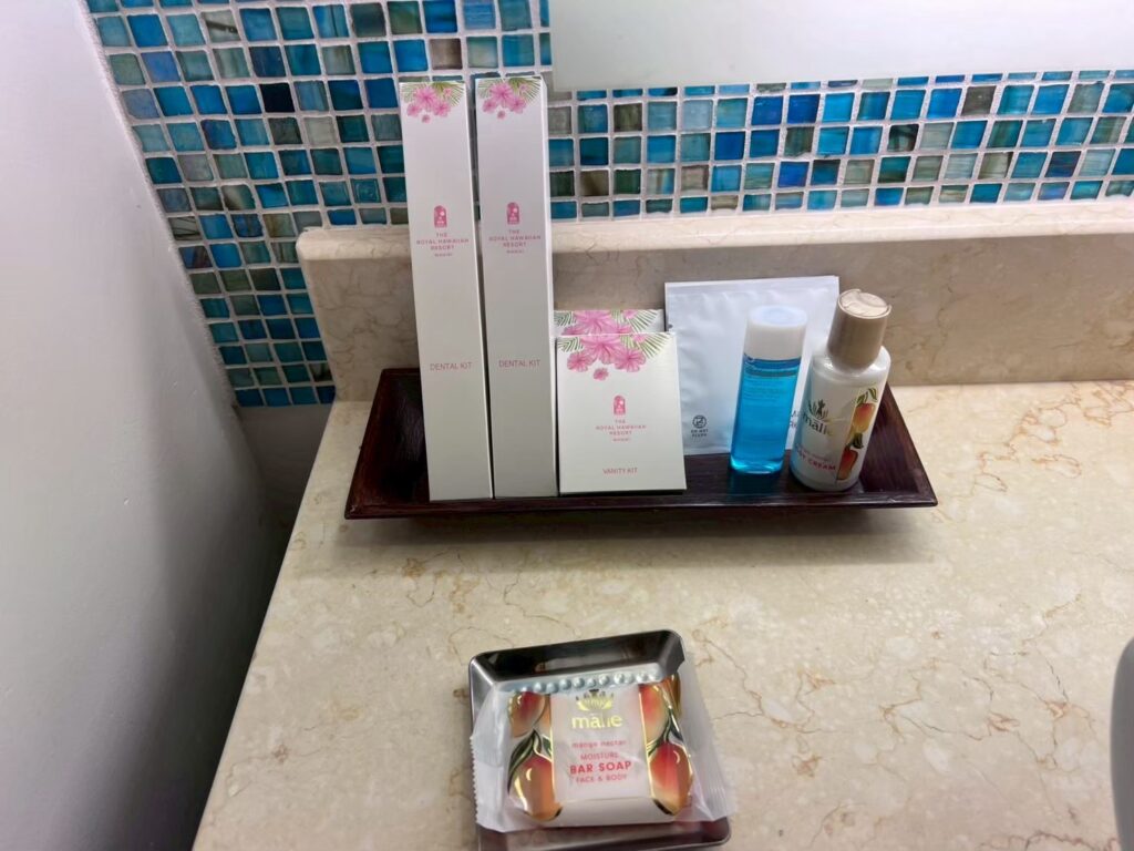部屋にはロイヤルハワイアン限定のピンク色のバスローブやアメニティも。