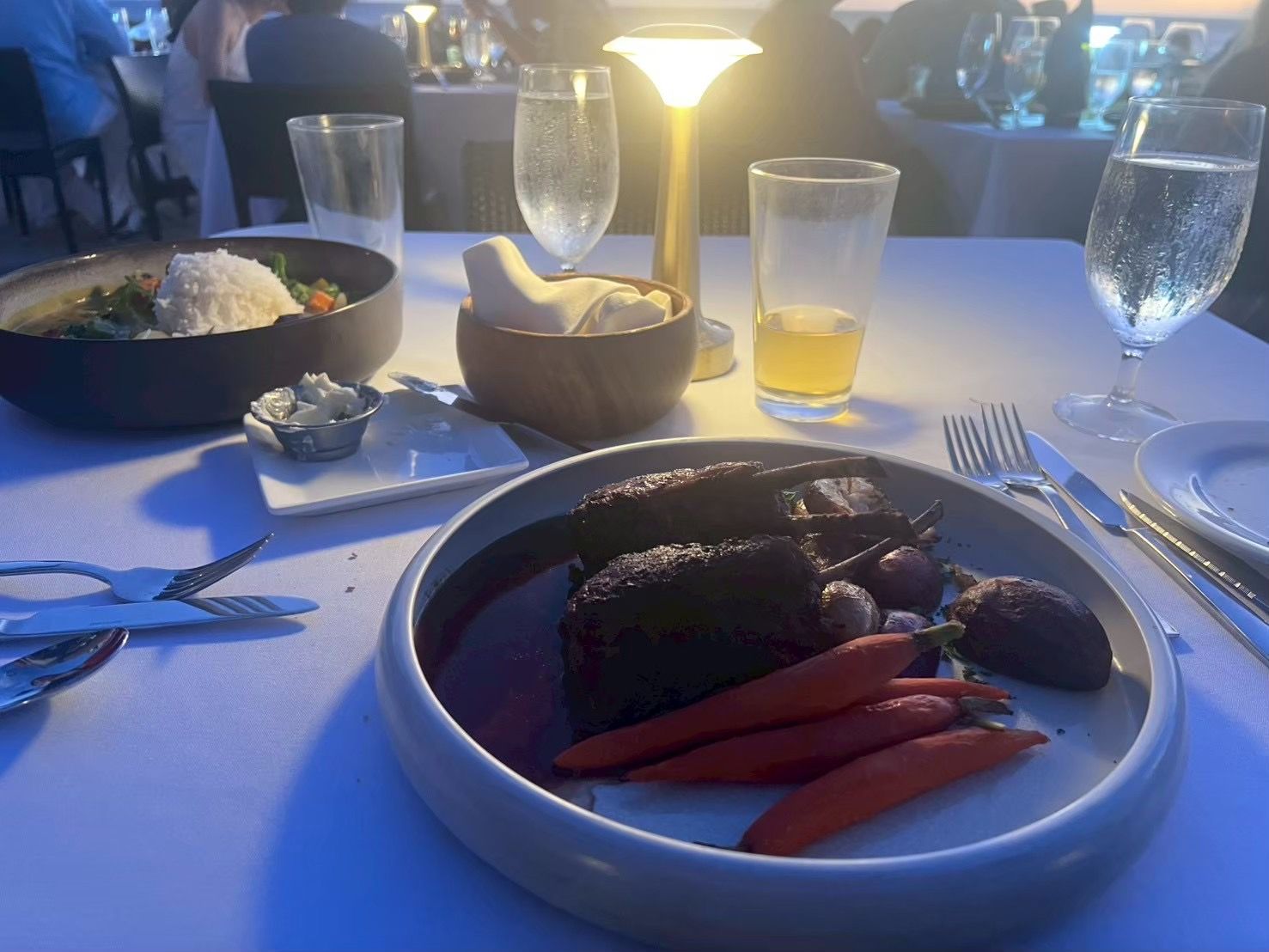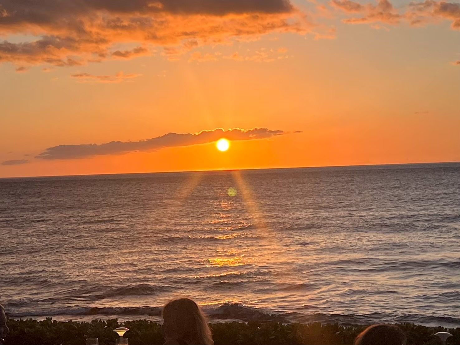 また、レストランkpcでディナーをいただきました。料理はもちろんのこと、景色が素晴らしかったです。ホノルルからは見えなかったのですが、ハワイ島からだと海の上に沈む夕日が見れました。